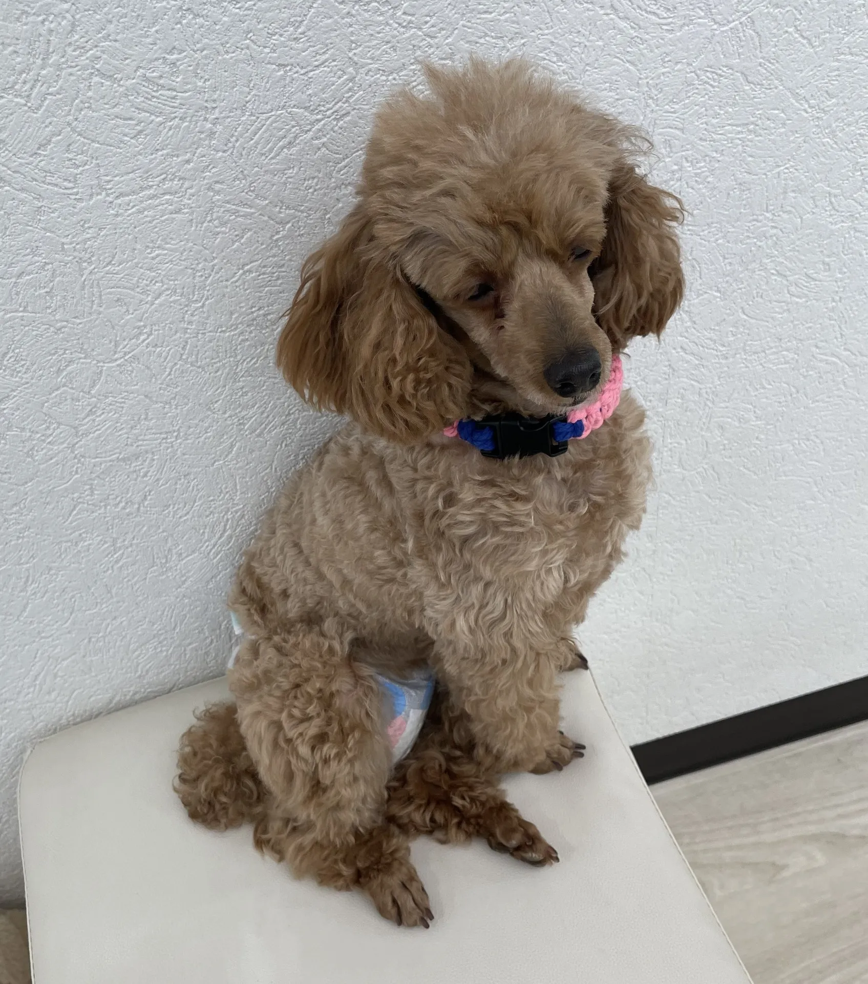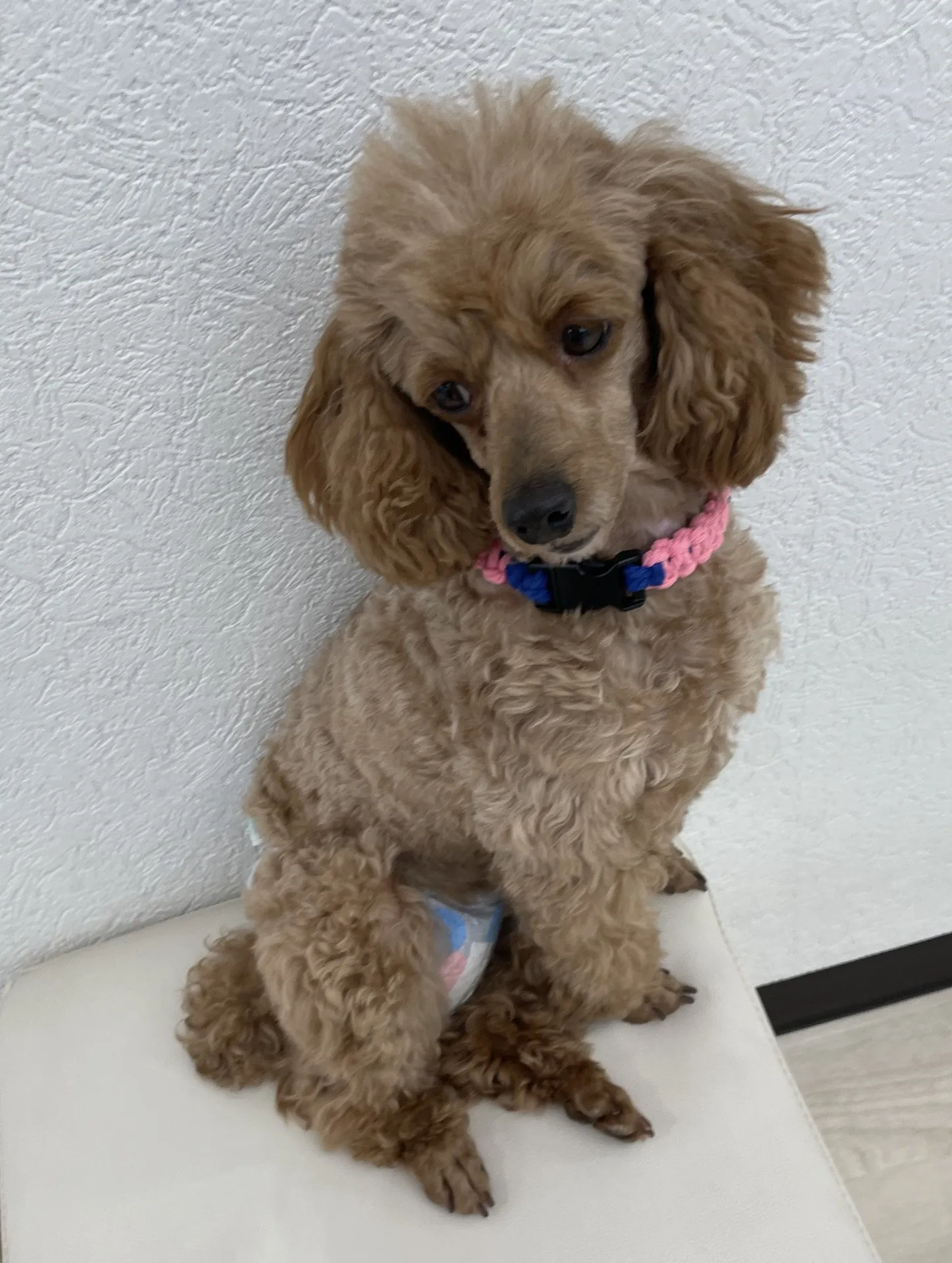 トイプードルの女の子で、推定年齢5歳。体重は約5㎏で、スタッフからは「ムシュ」、私は「ブーちゃん」と勝手に呼んでいます(笑)😊。人が大好きで、抱っこも大歓迎なムシュですが、小さなお子様は少し苦手のようで、吠えてしまうことが…。お許しを!😅